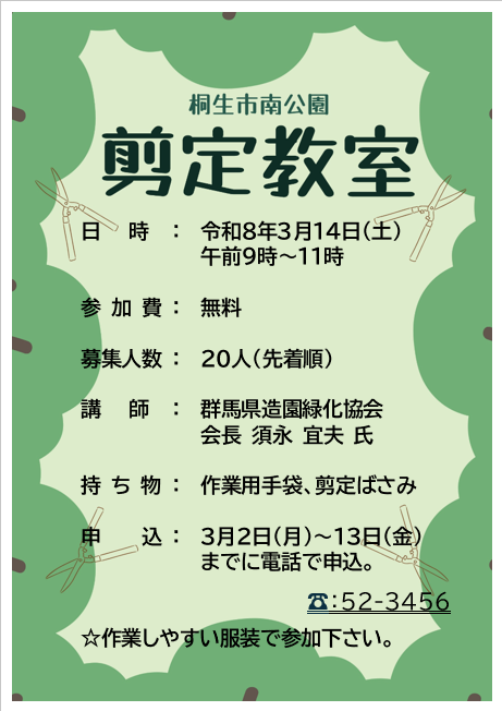「桐生市南公園剪定教室」開催のお知らせ